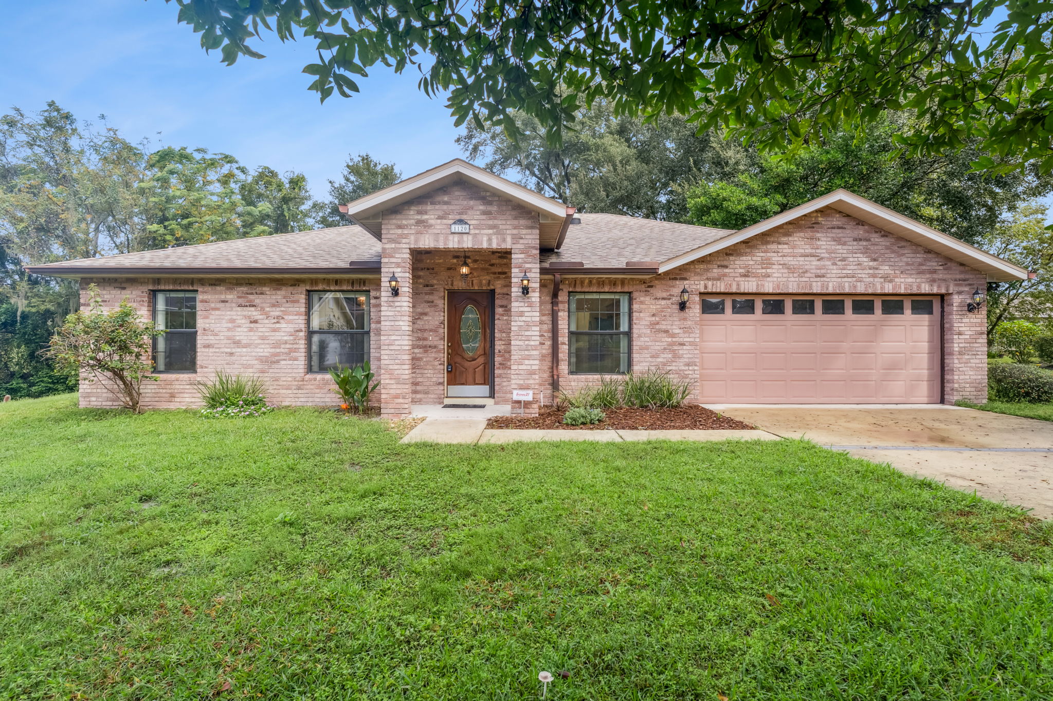 Enjoy the screened lanai overlooking the fenced backyard with pond and trees. Curb appeal includes a brick front and oversized driveway (parks four). Bonus: central vacuum.
